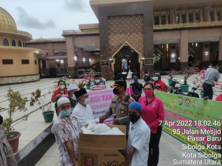 Sibolga, Pijar Tapanuli - Kapolres Sibolga AKBP Taryono Raharja,SH,SIK dan Ketua Bhayangkari Cabang Sibolga Ny Ria Taryono bersama dengan anggota Bhayangkari Cabang Sibolga, Pemuda Batak Bersatu kota Sibolga dan Ikatan Jurnalistik Televisi (IJTI) Sibolga Tapteng memberikan takjil di 10 mesjid dikota Sibolga kepada masyarakat yang melaksanakan ibadah puasa, Kamis, (7/4).