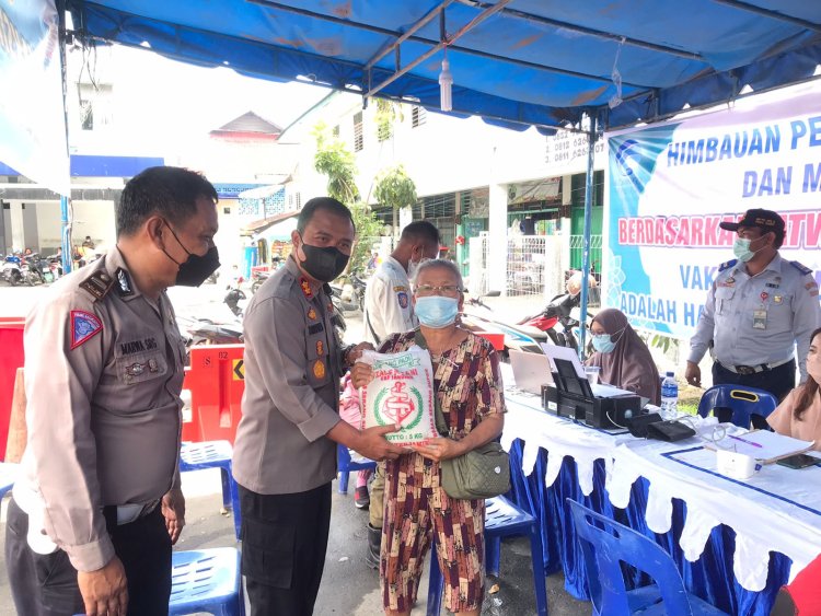 Sibolga, Pijar Tapanuli - Kapolres Sibolga, AKBP Taryono Raharja memberikan bantuan kepada lansia (Lanjut Usia) pada pelaksanakan akselerasi percepatan vaksin dibulan Ramadhan 1443 H, selasa (5/4).