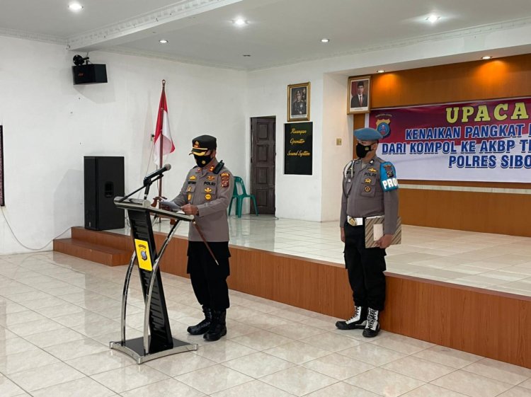 Kapolres Sibolga AKBP Taryono Raharja, S.H., S.IK, bertindak sebagai Irup dalam upacara kenaikan pangkat setingkat dari Kompol ke AKBP Periode 01 Januari 2022, Kepada Kompol R.Sihombing,SH menjadi AKBP, Jum'at (3/6/2022) pukul 14.30 wib di aula Wira Pratama Polres Sibolga dengan Danup Kanit Tipikor Sat Reskrim Polres Sibolga Ipda Pasma Pasaribu,SE,MM.