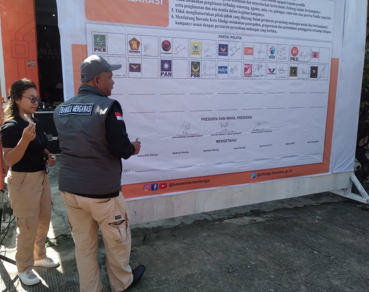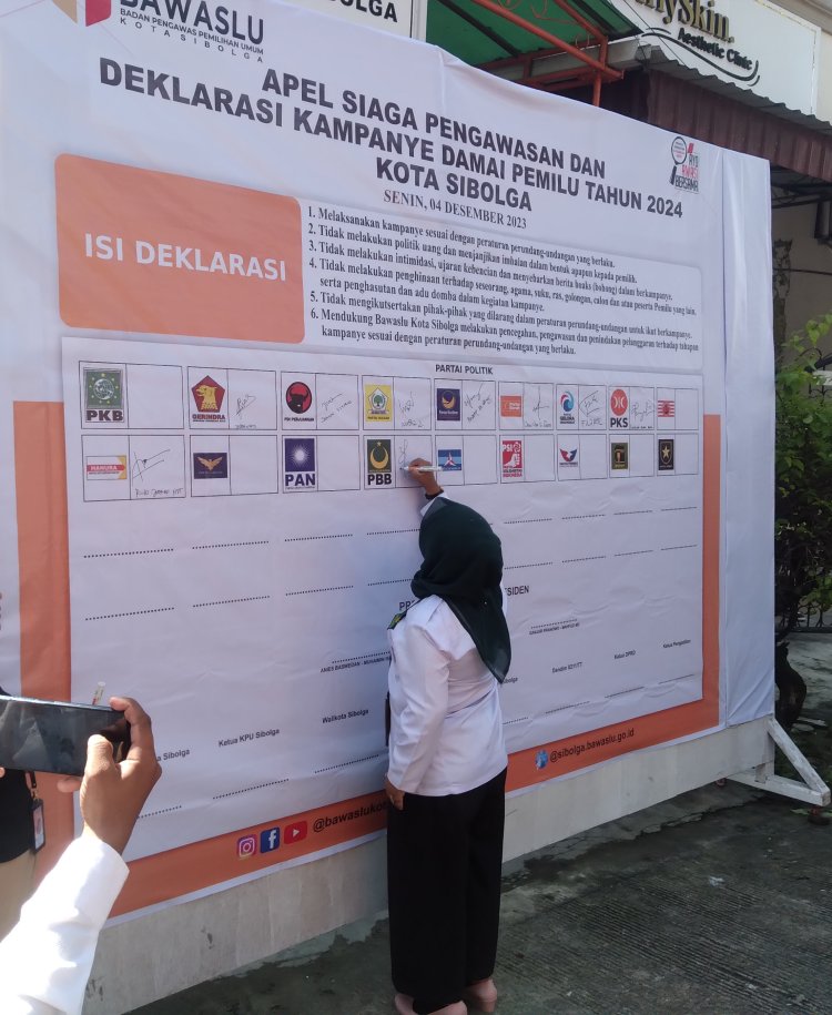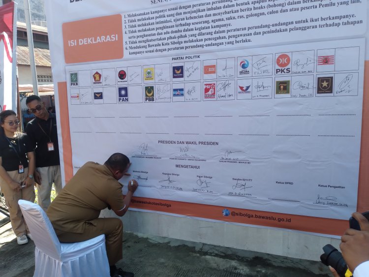 Penanda tanganan Deklarasi ajakan, Pemilu Damai 2024, dihadiri 14 parpol peserta pemilu di kota Sibolga dari 18 partai yang ikut pemilu tahun 2024. Juga hadir ketua KPU Sibolga, Afwan Nasution, Kajari Sibolga, Kapolres Sibolga, Ketua PN Sibolga. (Son)
