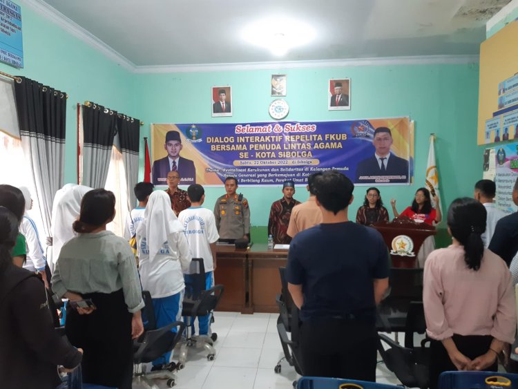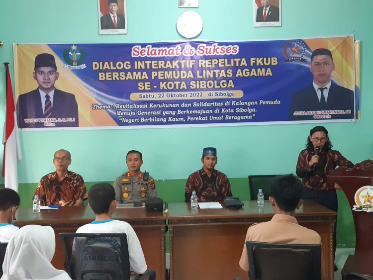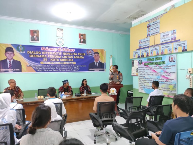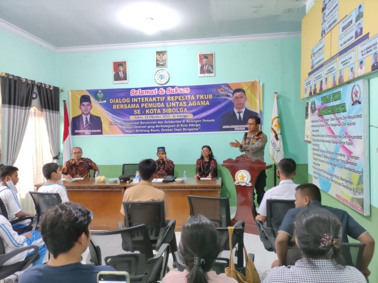 Sibolga, Pijar Tapanuli - Kapolres Sibolga AKBP Taryono Raharja,SH,SIK,MH hadiri dialog interaktif Repelita FKUB bersama pemuda lintas agama se kota Sibolga dengan tema " Revitalisasi kerukunan dan solidaritas dikalangan pemuda menuju generasi yang berkemajuan dikota Sibolga negeri berbilang kaum perekat umat beragama" Sabtu 22/10/2022 di aula kantor FKUB Sibolga di Jl.R.Suprapto No.56 Kel.Pasar Belakang, Kec.Sibolga Kota, kota Sibolga.