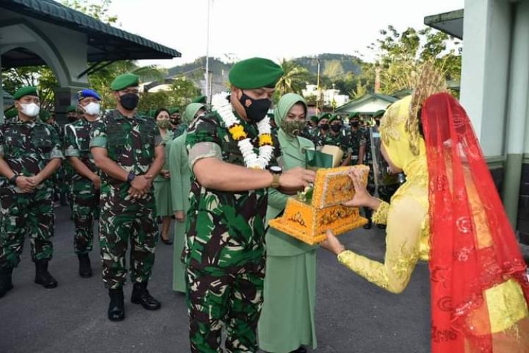 Sibolga, Pijar Tapanuli - Komando Resor Militer 023/KS gelar acara tradisi penyambutan kepada Danrem 023/KS yang baru Kolonel Inf Dody Triwinarto.S.I.P.M.Han beserta Ibu Ketua Persit KCK Koorcabrem 023 PD I/BB di Makorem 023/KS, Jalan Datuk Hitam No1 Sibolga, Selasa (12/4).
