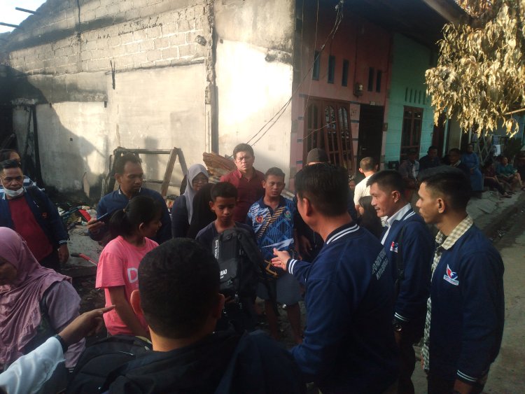 Sibolga, Pijar Tapanuli - Ketua DPD Partai Perindo kota Sibolga Michel Fuater bersama pengurus DPD Partai Perindo kota Sibolga, dàn calon anggota Legislaif (Caleg) DPR RI partai Perindo dari Daerah Pemilihan (Dapil) Sumut 2, Pebri W. Parsa Sihombing, kamis (15/6) di lokasi kebakaran gang Lapo Sona lingkungan 1 kelurahan kota beringin kecamatan Sibolga Kota, kota Sibolga, menyerahkan bantuan kepada korban kebakaran yang terjadi beberapa hari lalu yang menyebabkan 2 unit rumah yang didiami 3 kepala keluarga musnah terbakar.