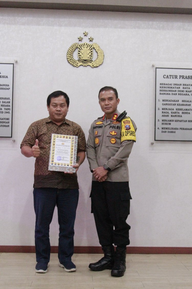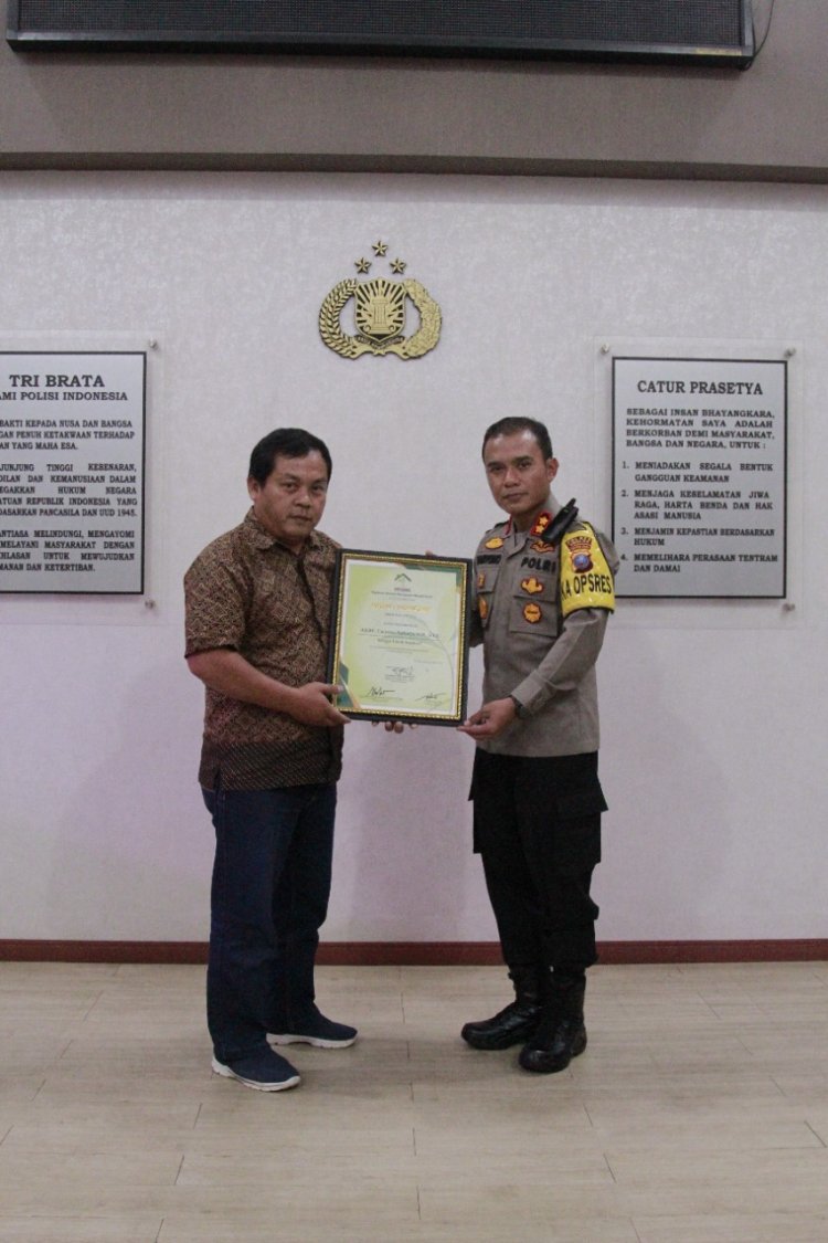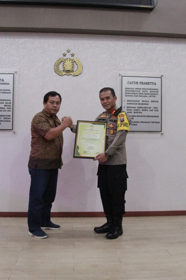 Sibolga, Pijar Tapanuli - Kapolres Sibolga AKBP Taryono Raharja,SH,SIK,MH menerima piagam penghargaan dari tokoh inspiratif Yayasan Rumah Mangrove Merah Putih Wibi Nugraha, kamis (6/10) dilobby Polres Sibolga.