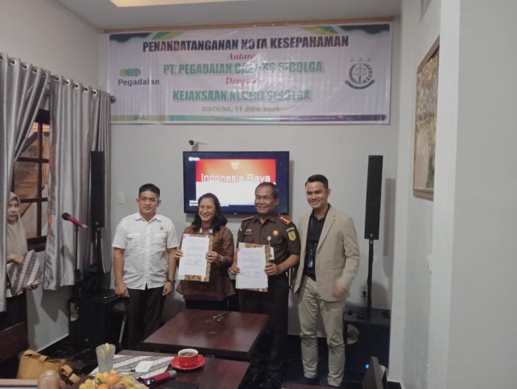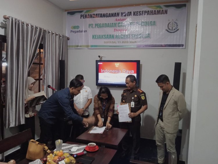 Untuk merealisasikan kerjasama tersebut, Kajari Sibolga, Syaifful Alam Yuliastana dan Pemimpin Cabang Pegadaian Sibolga, Fitra Roria Tindaon melakukan penandatanganan MoU yang disaksikan langsung Deputi Bisnis Pegadaian Area Rantau Prapat, Fauzi Gazali, Kepala Departemen Produk Non Gadai, Rahadian Nur Maulana, Kepala Bagian Humas & Protokoler Kanwil 1 Medan, Gopher Manurung, dan Legal Officer Kanwil 1 Medan, Hisbah R. Putra.(Son)