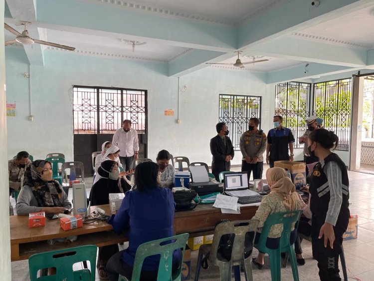 Usai memberikan bantuan, Kapolres Sibolga AKBP Taryono Raharja, S.H, S.I.K meninjau pelaksanaan vaksinasi yang dilaksanakan oleh tim Vaksinator Polres Sibolga bertempat di Gedung Aula Gereja HKBP Sibolga Kota.