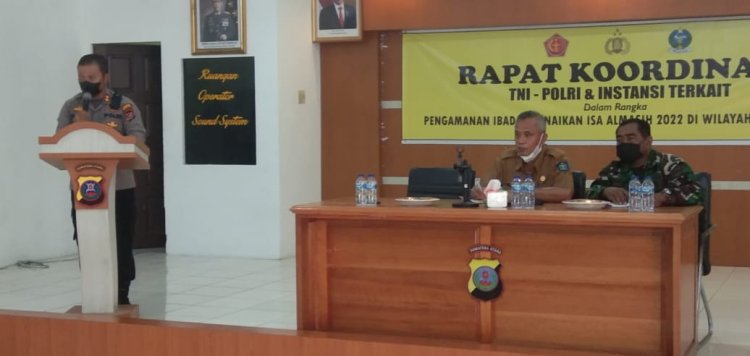 Sibolga, Pijar Tapanuli - Dalam rangka memperingati Kenaikan Isa Almasih tahun 2022 yang jatuh pada hari Kamis, (26/5) Kapolres Sibolga AKBP Taryono Raharja,SH,SIK gelar Rapat Kordinasi (Rakor) di Aula Wira Pratama Polres Sibolga Selasa, (24/5).